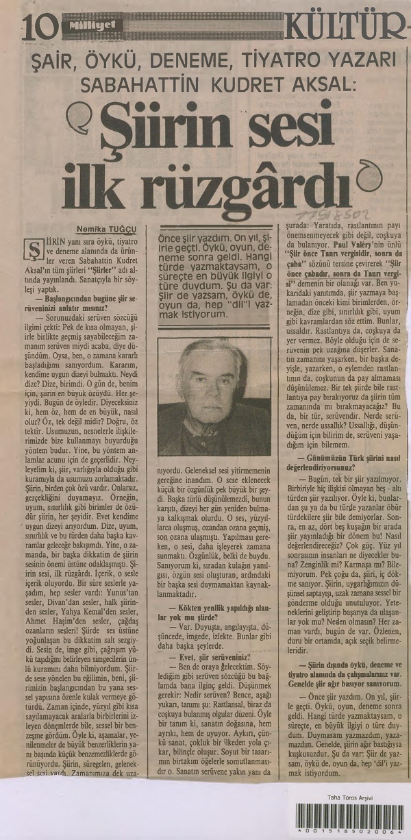 WebSabahattin Kudret Aksal: Türk şiirinin gök haritasında, geceleri uykusuz gemicilere yol gösteren takımada yıldızı. 1995’te yayımladığımız Şiirler (1938-1993)’te. WebSonuç olarak Sabahattin Kudret Aksal, şiirdeki (tema ve dil eksenli) de-ğişimi, dönüşümü kimi zaman erkenden kimi zaman gecikmeli de olsa fark ederek eserini devamlı taze. WebSabahattin Kudret Aksal'ın Eserleri . Şiir: Şarkılı Kahve (1944) Gün Işığı (1953) Duru Gök (1958) Bir Sabah Uyanmak (1962, ilk iki kitabın birlikte basımı) Elinle (1962) Eşik (1970).